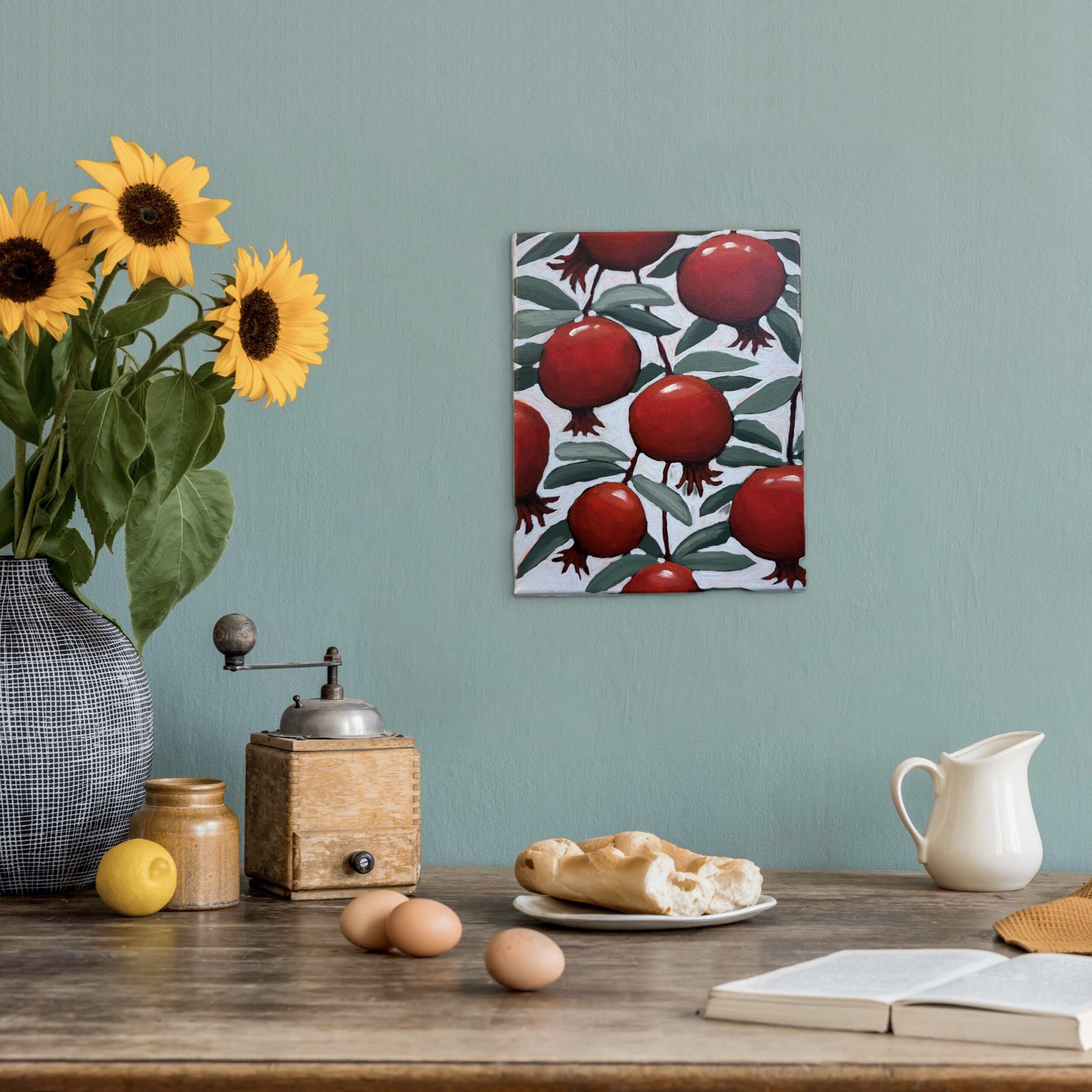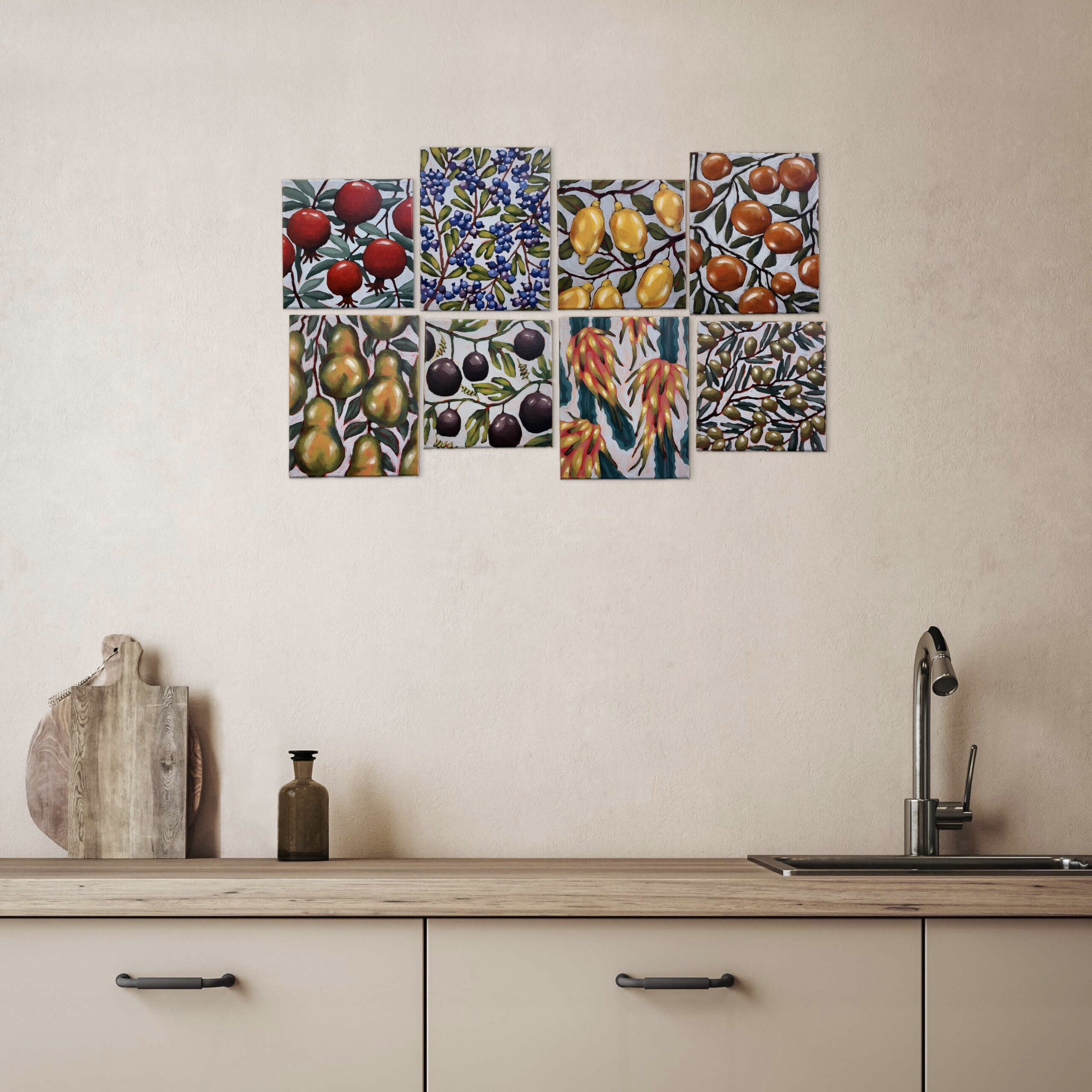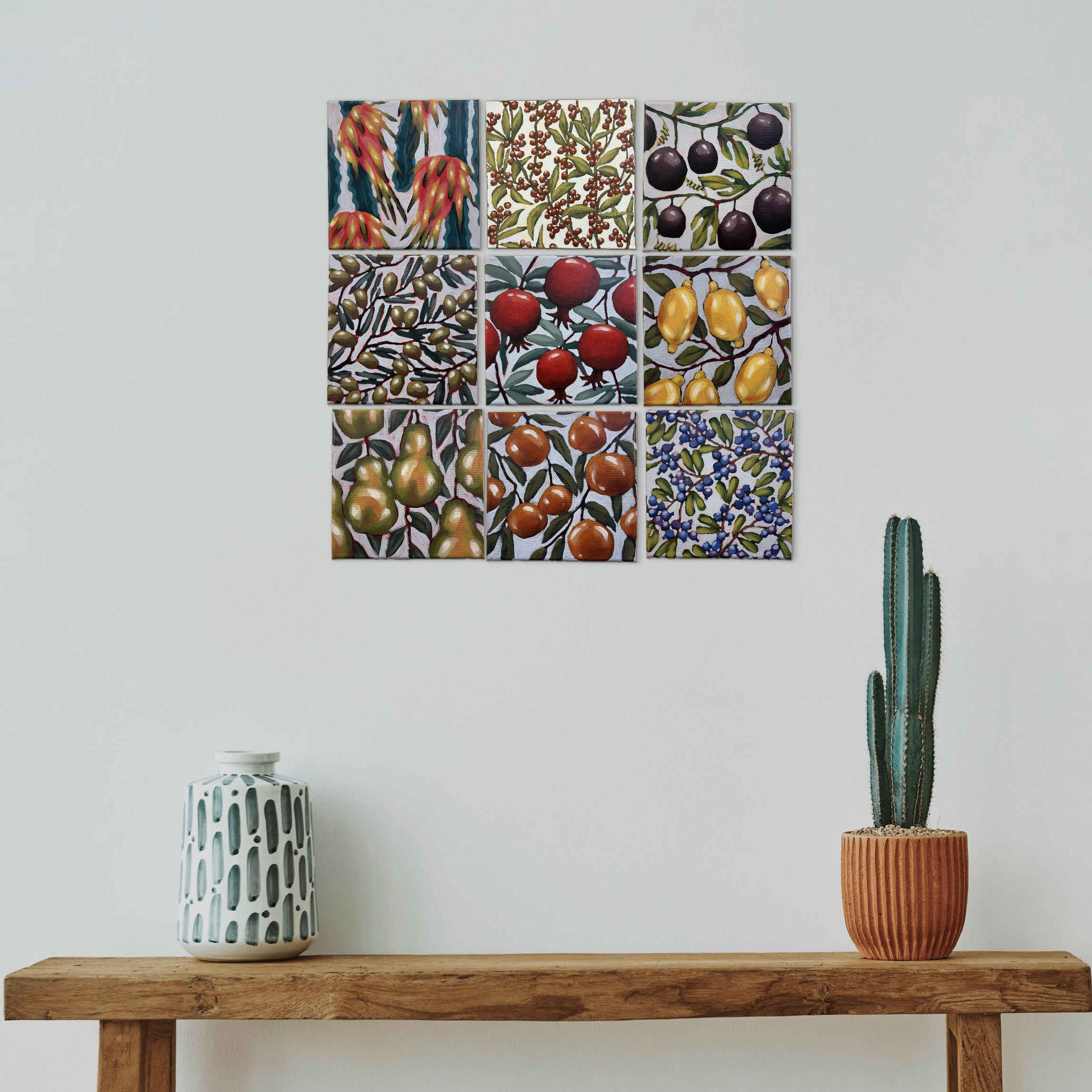 Each painting in my collection is a study of color, light, and simplicity. Working in acrylics with a bold orange underpainting, I capture the essence of a subject with minimal, deliberate strokes. The background sky is painted last, carved into fruit and foliage, giving each piece a crisp, vibrant, and organic feel.