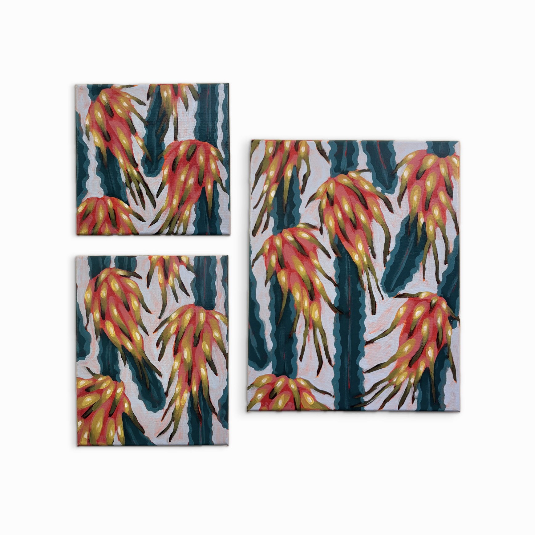 Dragon Fruit paintings 1 to 7 are 20cm x 20cm, Dragon Fruit paintings 8 to 14 are 25cm x 20cm and Dragon Fruit paintings 15 to 21 are 35.6cm x 27.9cm. Works available for purchase are listed on the Acquire page of the site.