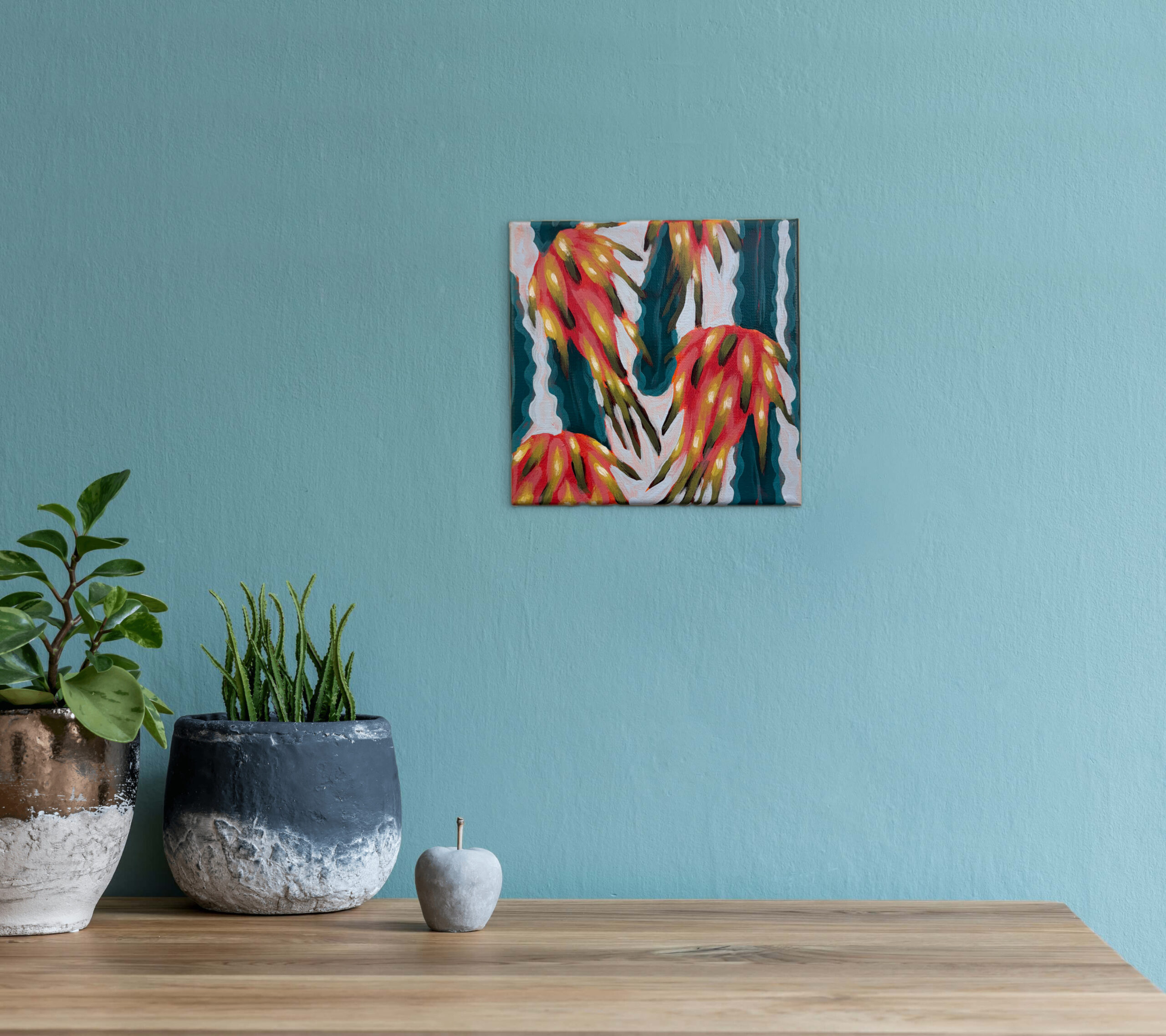 The square shape of these canvas’ allow them to be displayed with 20cm x 20cm and 25cm x 20cm pieces from the other limited series in the 2025 “Dappled Fruit Sky” collection.
